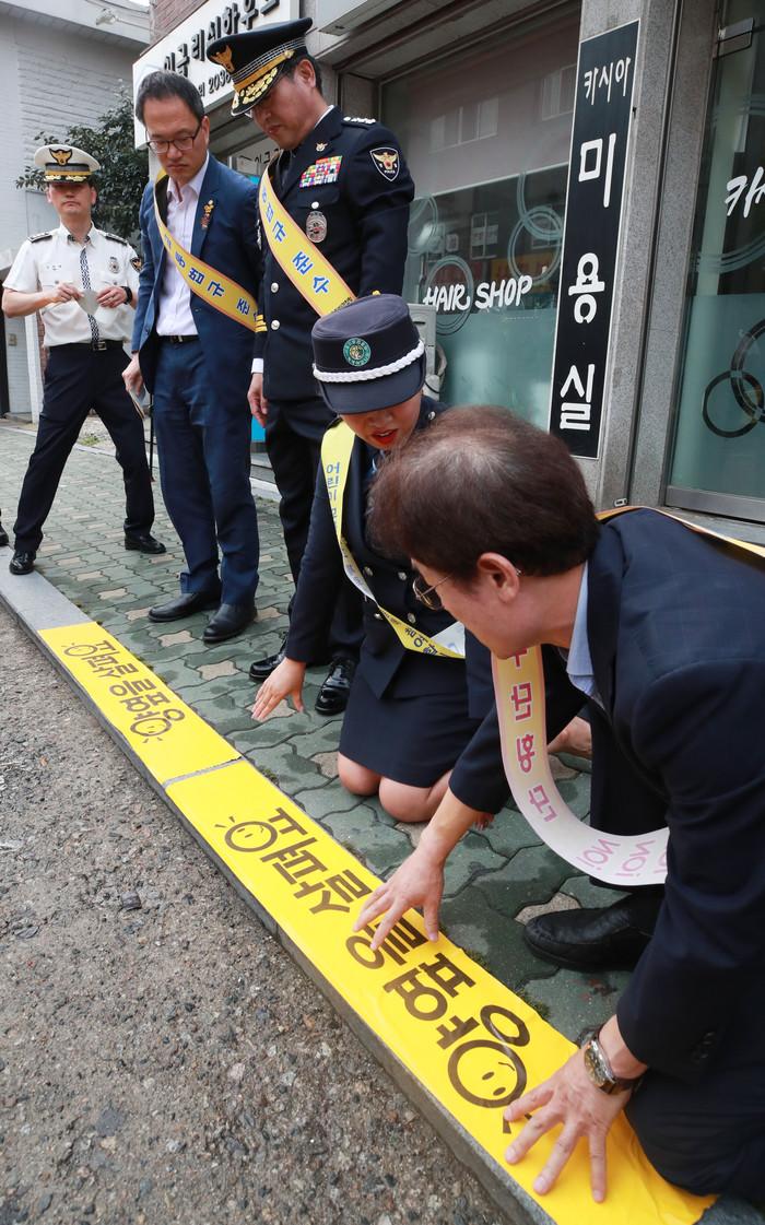 더불어민주당 박주민 의원, 이용표 서울지방경찰청장, 천경숙 전국녹색어머니 중앙회장, 조희연 서울시교육감(왼쪽부터)이 서울 은평구 역촌초등학교 앞에서 열린 '2019년 가을 신학기 교통안전 캠페인'에서 등굣길 교통안전을 위한 노란 발자국 스티커를 부착하고 있다.