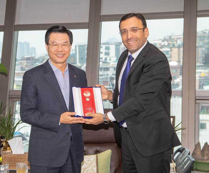 성장현 용산구청장이 12일 구청장 집무실에서 람지 카즘 오울루 테이무로프 주한 아제르바이잔 대사로부터 '한국·아제르바이잔 우호친선 공로상'을 받았다. 사진은 수상 후 성 구청장(왼쪽)과 테이무로프 대사의 기념촬영 모습. (사진제공=용산구청)