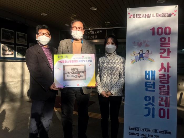 경기 의정부시 호원1동 지역사회보장협의체가 15일 성금 30만원을 호원1동 주민센터에 기탁하며 이웃사랑 나눔 운동인 ‘100일간 사랑릴레이 배턴 잇기’에 동참했다. 사진은 관계자들이 기념촬영을 하는 모습. (사진제공=의정부시청)
