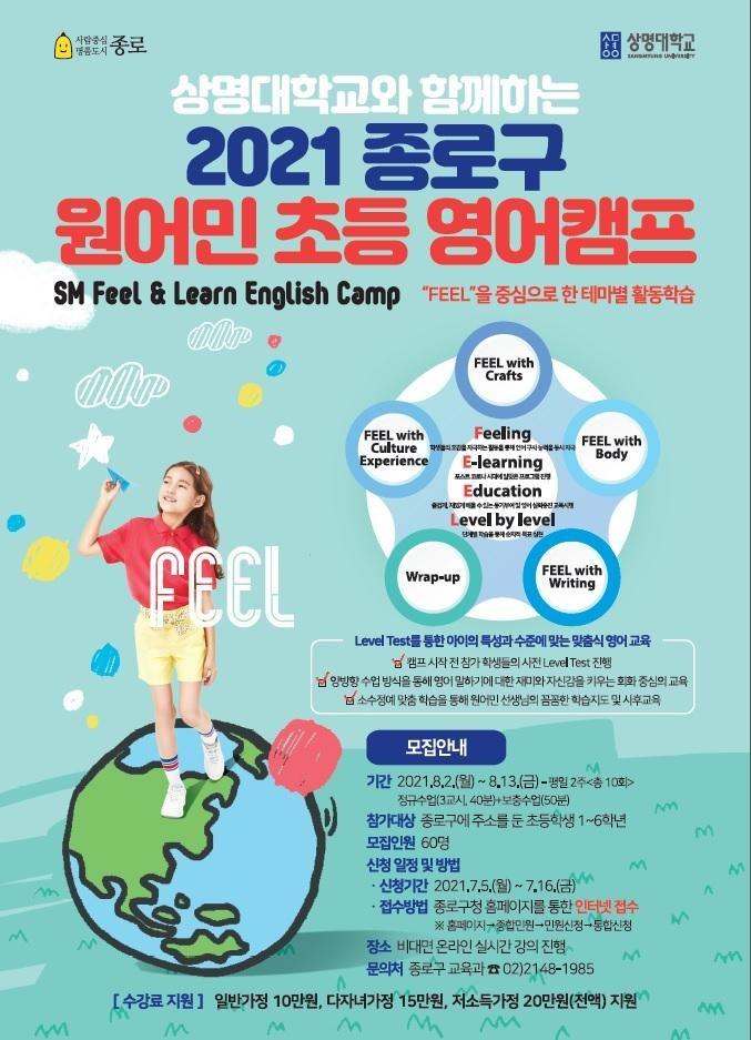 [시민일보 = 이대우 기자] 서울 종로구(구청장 김영종)가 오는 8월2~13일 지역 대학과 손잡고 지역내 학생들의 영어 실력 향상을 도울 ‘원어민 초등 영어캠프’를 운영한다.