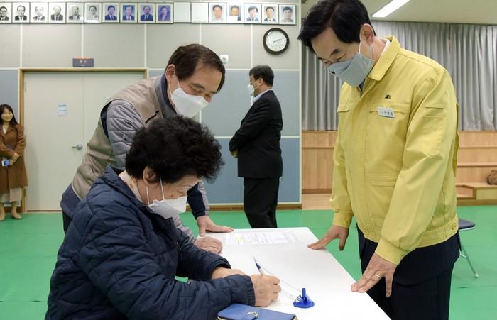 안병용 경기 의정부시장이 '경기도·의정부시 재난기본소득' 방문 접수를 대비해 지난 20일 가능동 주민센터 접수처를 방문해 직원들을 격려하며 현장을 점검했다. 사진은 안 시장(오른쪽)이 재난기본소득을 접수하는 시민들을 둘러보는 모습. (사진제공=의정부시청)