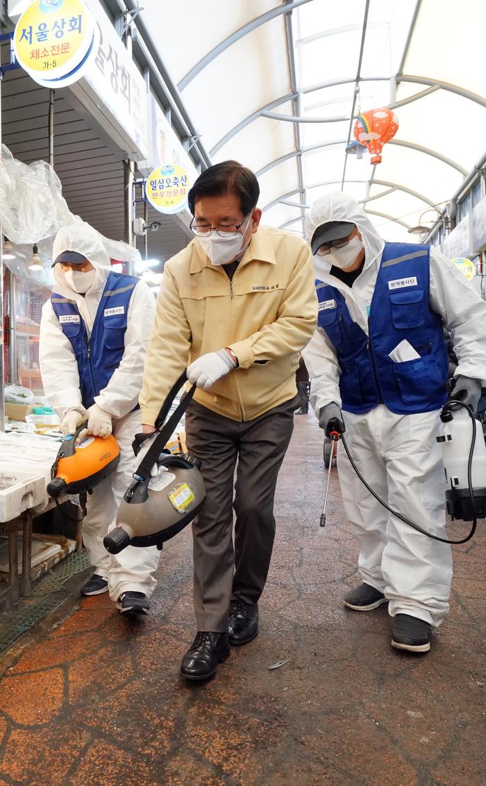 최근 유덕열 서울 동대문구청장은 코로나19 사태로 인해 문화강좌가 임시 휴강된 자치회관 및 다중이용시설에 방문해 현장상황을 살폈다. 사진은 청량리 주변 전통시장을 방문한 유 구청장(가운데)이 방역작업에 동참하고 있는 모습. (사진제공=동대문구청)