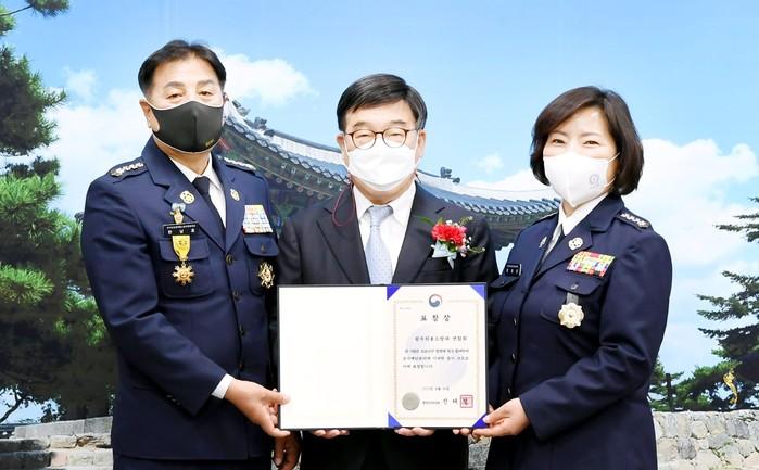 경기 광주의용소방대연합회는 지난해 코로나19 발생 초기부터 지속적으로 취약계층을 위한 감염병 예방활동 등 방역소독 및 캠페인을 추진한 공로를 인정 받아 최근 행정안전부장관 표창을 받았다. 사진은 7일 신동헌 시장(가운데)이 광주의용소방대연합회에 표창을 전수하고 있는 모습. (사진제공=광주시청)