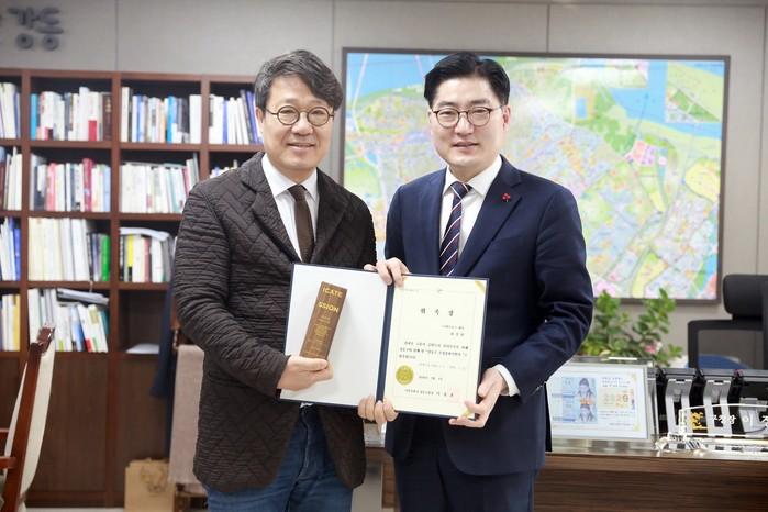 | ▲ 지난 7일 구청에서 이정훈 구청장(오른쪽)이 최신현 대표에게 조경총괄기획가 위촉장을 수여했다. (사진제공=강동구청) |