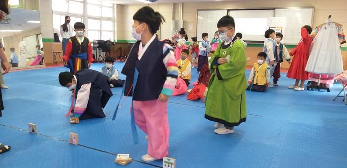 전남 곡성군이 최근 곡성중앙초등학교 저학년을 대상으로 '찾아가는 한복문화교실'을 운영했다. 사진은 학생들이 한복을 입고 비석치기 놀이를 하고 있는 모습. (사진제공=곡성군청)