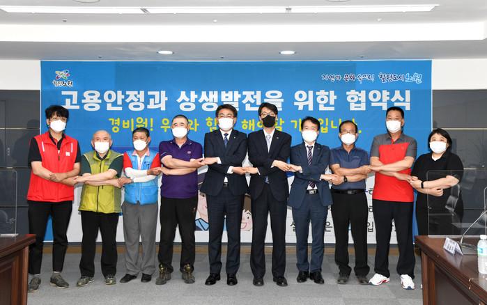 오승록 서울 노원구청장이 최근 중계동 아파트 경비원 고용 관련 협약식에 참석했다. 이 협약식은 지난 4월 재계약 이틀 전 문자로 해고 통보를 받은 경비원 집단해고사태가 구청의 중재로 합의돼 복직희망 경비원과 경비업체·구의 3자간 협약을 위해 마련됐다. 사진은 협약식에서 오승록 구청장(가운데)과 관계자들이 기념촬영을 하는 모습. (사진제공=노원구청)