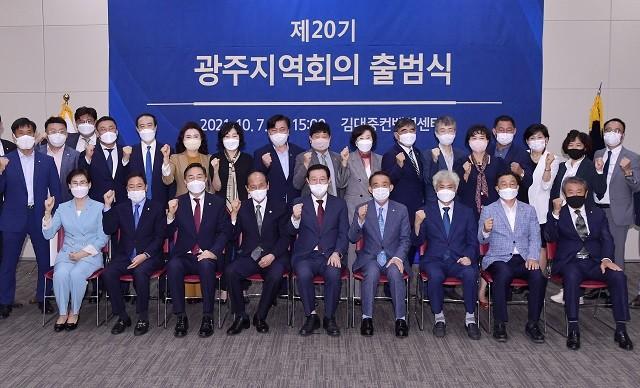 [광주=정찬남 기자] 이용섭 광주광역시장(앞줄 가운데)이 7일 오후 서구 김대중컨벤션센터에서 열린 민주평통 광주지역회의 제20기 자문위원 출범식에 참석해 신임 김선남 민주평통 광주지역회의 부의장, 김용집 광주시의회 의장 등 내빈들과 기념촬영을 하고 있다.