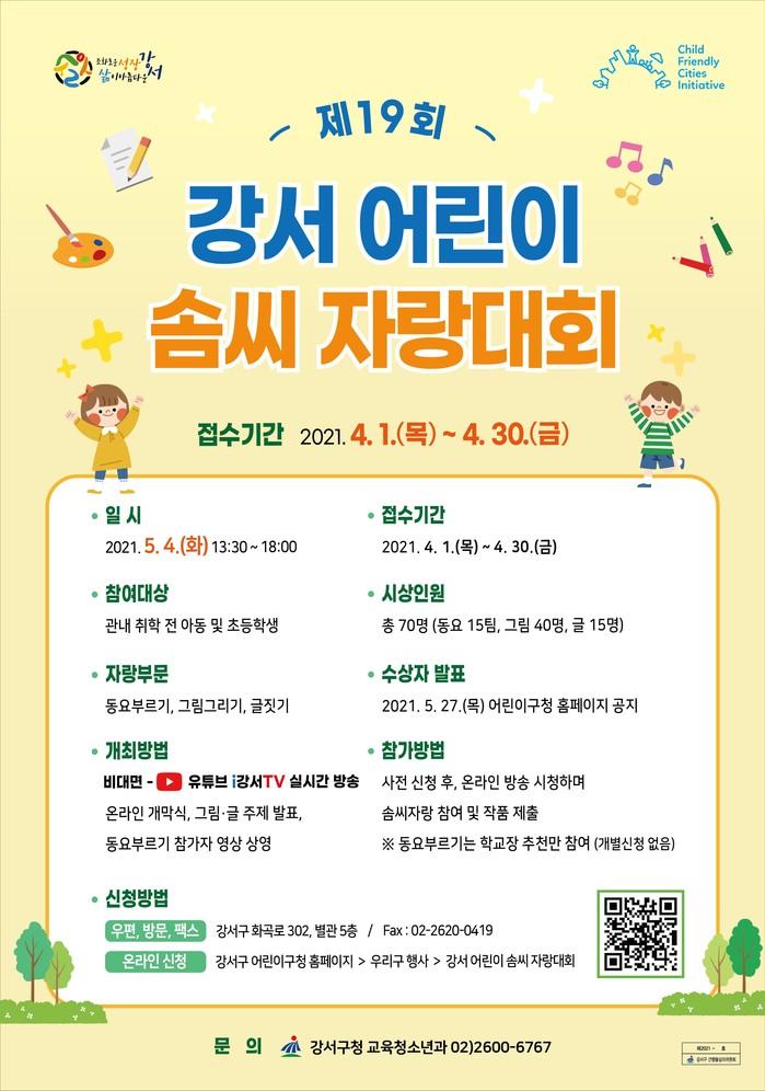 [시민일보 = 홍덕표 기자] 서울 강서구(구청장 노현송)는 5월 청소년의 달을 맞아 오는 5월4일 온라인으로 열리는 '제19회 강서 어린이 솜씨 자랑대회'에 참가할 어린이들을 이달 1일부터 30일까지 모집한다.