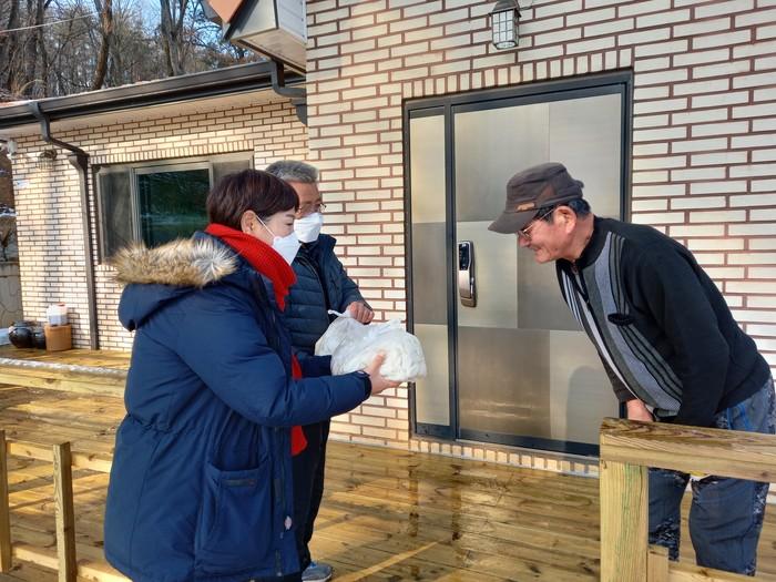 인천 강화군 내가면 오상1리노인회는 최근 떡국용 가래떡 300kg(시가 100여만원 상당)을 마련해 지역내 주민에게 전달했다. 사진은 오상1리노인회에서 지역내 주민 가구를 방문해 가래떡을 전달하고 있는 모습. (사진제공=강화군청)