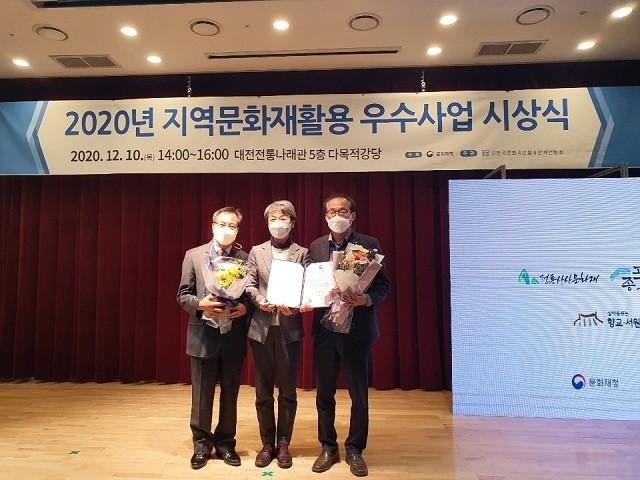 | ▲ 강진군 시문학파기념관 관계자들이 10일 대전전통나래관 5층 다목적 강당에서 열린 2020년도 지역문화재활용한 '더 샵 252 영랑생가'프로그램이 정부 평가에서 우수 사업에 선정돼 문화재청장 표창을 수상 한 후 기념촬영을 하고 있다. / 강진군 제공 |