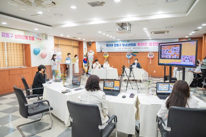 서울 강동구가 최근 강동구 청소년의회 ‘온라인 열린의회’를 개최했다. 이번 행사는 아동·청소년 참여기구 아동들이 ‘아동친화행복도시 강동’을 위해 직접 관련 정책에 대해 자유롭게 제안하고자 마련됐다. 사진은 온라인 열린의회에서 이정훈 구청장(가운데)이 발언을 하는 모습. (사진제공=강동구청)