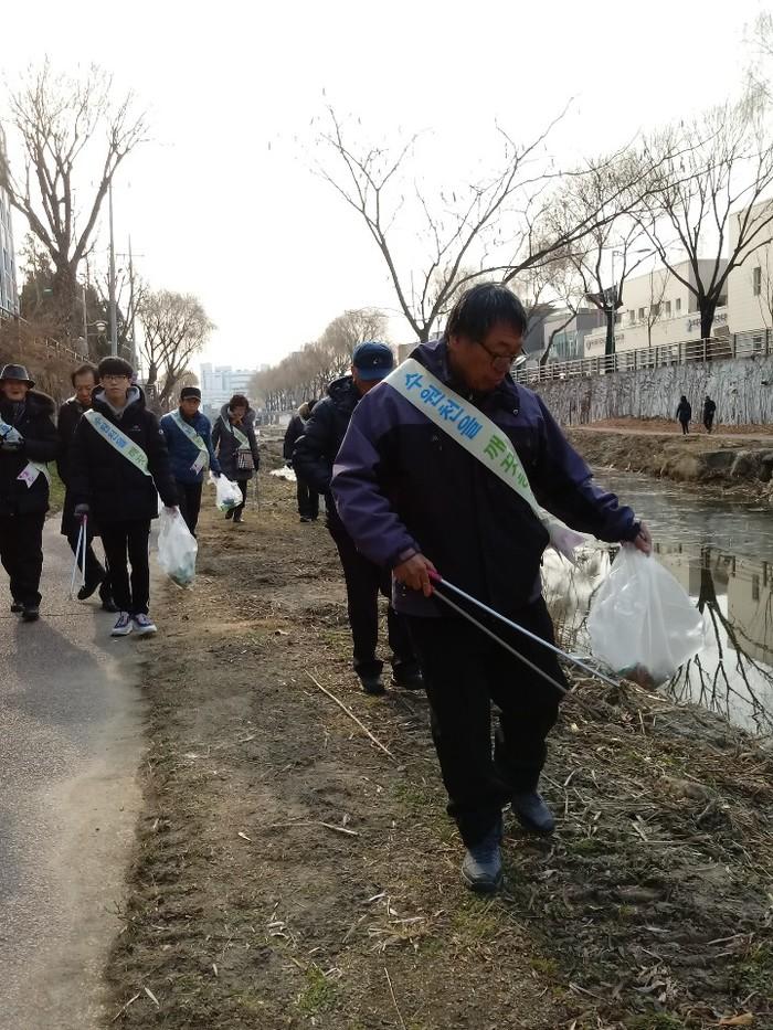 경기 수원시 팔달구는 수원시 대표 환경단체 중 하나인 ‘수원시금빛봉사회’와 함께 최근 수원천 일원에서 환경정화 활동과 환경보전 캠페인을 전개했다. 사진은 참여자들이 쓰레기를 수거하고 있는 모습. (사진제공=팔달구청)