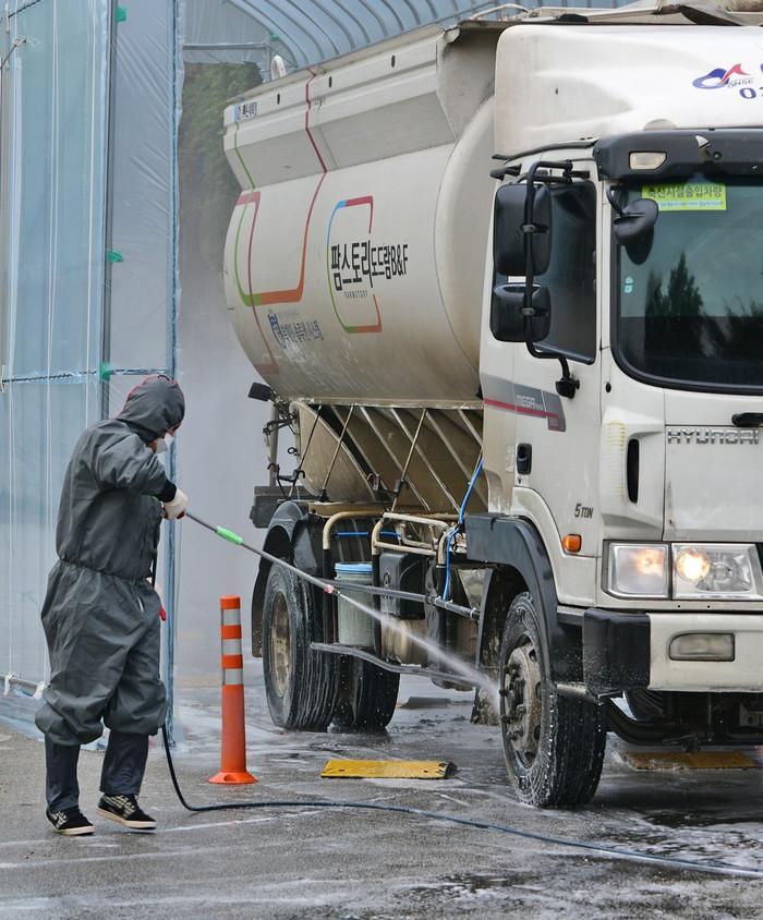 충남 홍성군은 아프리카돼지열병이 확산됨에 따라 최근 ‘심각’ 단계의 재난안전대책본부를 운영하고 3곳의 거점소독시설과 12곳의 이동통제초소를 추가 설치, 강도 높은 방역활동을 전개하고 있다. 사진은 거점소독시설에서 소독을 하는 모습. (사진제공=홍성군청)