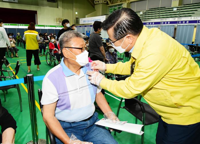 류경기 서울 중랑구청장이 17일 중랑구 코로나19 예방접종센터에서 접종을 마친 노인에게 접종배지를 달아줬다. 배지는 접종을 직접 증빙하는 기능은 없지만 접종 완료자의 일상회복 지원에 기여할 것으로 보인다. 사진은 이날 류 구청장(오른쪽)이 접종받은 노인에게 배지를 달아주고 있는 모습. (사진제공=중랑구청)