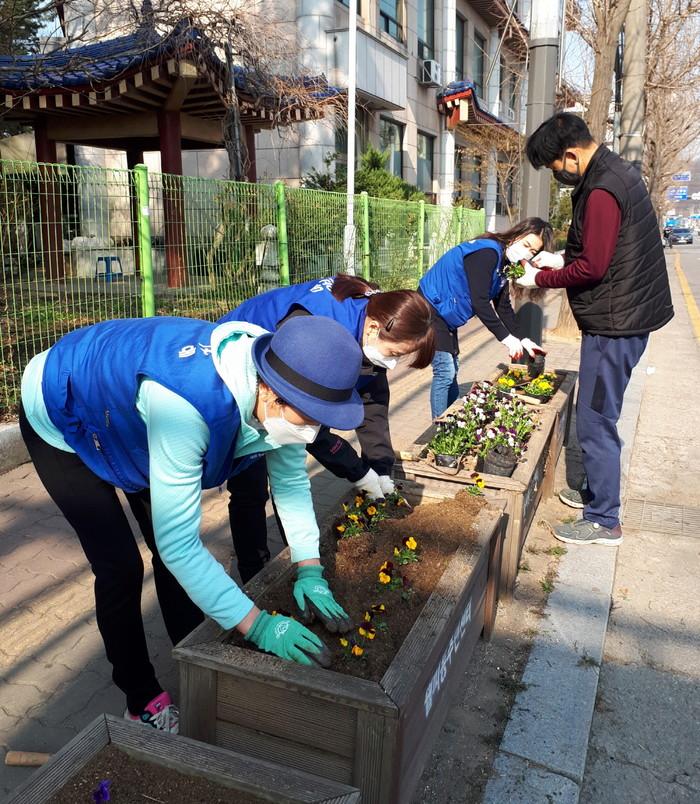 경기 안산시 상록구 월피동 주민자치위원회와 바르게살기위원회는 25일 코로나19로 어려움을 겪고 있는 화훼농가를 살리기 위해 가로화단, 학교, 안산천 주변에 꽃잔디·팬지·비올라 등 봄꽃 2000여본을 심었다. 사진은 꽃을 심고 있는 모습. (사진제공=안산시청)