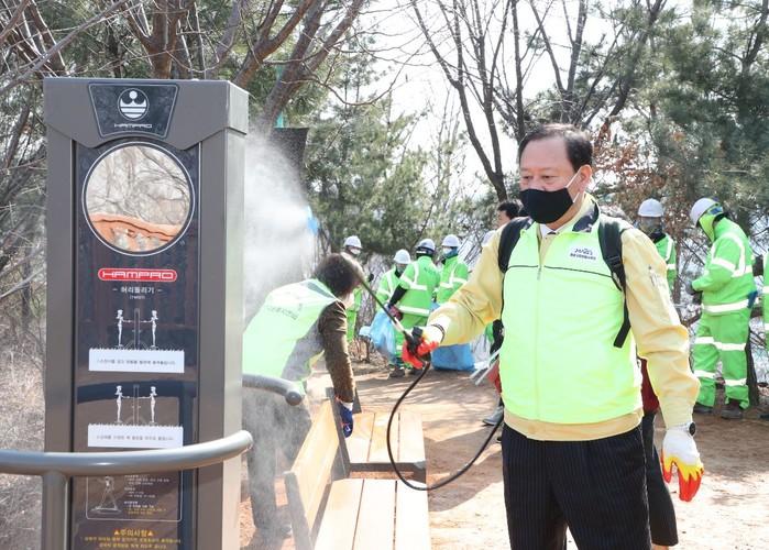 서울 마포구가 이달 기온 상승에 따라 이용객이 점차 증가할 것으로 예상되는 성미산 등 지역내 산책로 6곳에 대해 오는 4월 초까지 대청소 및 방역작업에 돌입한다. 사진은 최근 성미산 일대 대청소 및 방역작업에 동참한 유동균 구청장이 시설물을 방역하는 모습. (사진제공=마포구청)