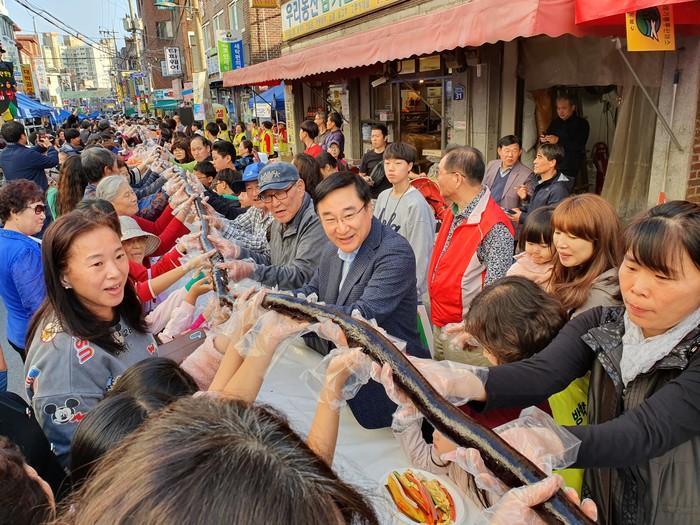도봉구 방학2동은 최근 지역 주민과 상인 등이 다같이 어울릴 수 있는 ‘제2회 방학2동 모모모 축제’를 개최, 1년에 한 번 하나되는 축제라는 의미로 111m 김밥말기를 했다. 사진은 이동진 구청장과 주민들이 김밥을 들고 있는 모습. (사진제공=도봉구청)