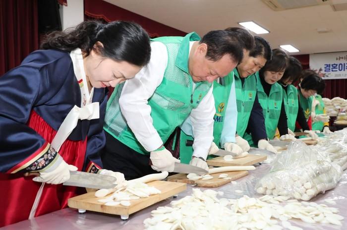 유동균 마포구청장이 21일 성산1동에서 구 새마을부녀회 주관으로 열린 '결혼이주여성과 함께하는 설맞이 떡국 나누기' 행사에 참여했다. 사진은 유 구청장(왼쪽 두 번째)과 행사 참여자들이 지역내 저소득 가정에게 전달할 떡국 떡을 써는 모습. (사진제공=마포구청)