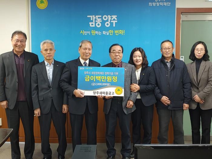 경기 양주시 새마을금고는 19일 양주시 희망장학재단에 장학금 200만원을 기부했다. 희망장학재단은 이날 기부식을 열고 새마을금고 관계자들에게 감사의 뜻을 전했다. 사진은 새마을금고 및 희망장학재단 관계자들이 기념촬영을 하는 모습. (사진제공=양주시청)