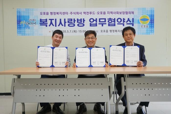 경기 광주시 오포읍행정복지센터가 7일 읍 지역사회보장협의체, (주)역전푸드와 복지사각지대 발굴 및 취약계층 지원을 위한 '오포읍 복지사랑방' 업무 협약을 체결했다. 사진은 협약 체결 후 관계자들이 기념촬영을 하고 있는 모습. (사진제공=광주시청)