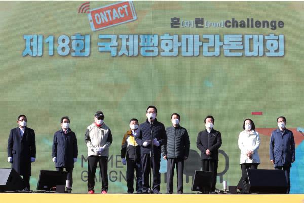 서울 강남구는 실시간 경기영상을 온라인과 대형미디어에 생중계하는 '온택트 국제평화마라톤대회'를 지난 24일 개최했다. 3700명의 참가자가 참가했으며 참가비 전액은 코로나19 극복을 위한 단체에 기부했다. 사진은 정순균 구청장이 삼성동 코엑스 K-POP 광장에서 진행된 개회식에서 대회의 시작을 알리고 참가자들의 완주를 응원하는 모습. (사진제공=강남구청)