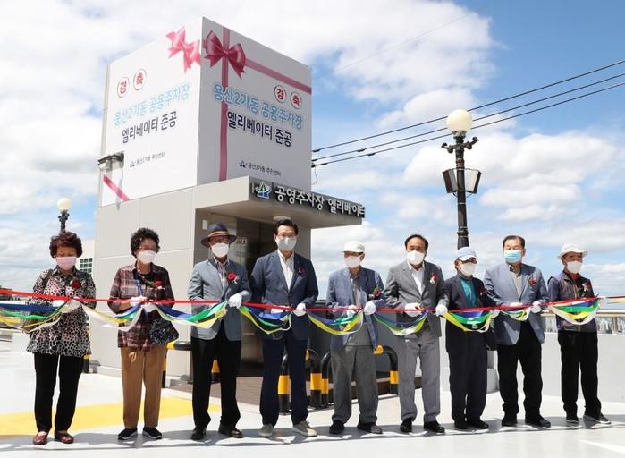 서울 용산구가 지난 16일 용산2가동 공영주차장 이동편의시설 및 주민쉼터 개소식을 열었다. 기존 공영주차장에 엘리베이터(7인승)를 신설해 옥상부까지 연결하고 신흥로~소월로를 잇는 지름길을 만들었으며 옥상에는 주민쉼터를 조성했다. 사진은 개소식에서 성장현 구청장(왼쪽에서 네 번째)이 관계자들과 테이프커팅을 하는 모습. (사진제공=용산구청)