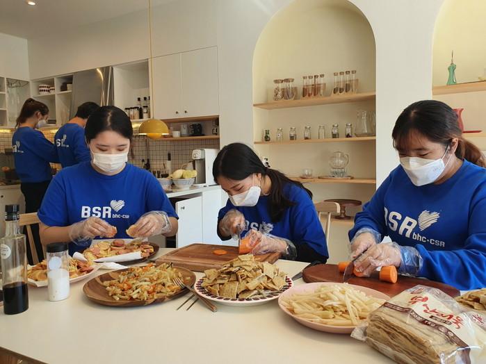 ▲ 봉사단원들이 홀몸노인들에게 전달하기 위한 밑반찬을 만들고 있다. (사진제공=bhc치킨) |