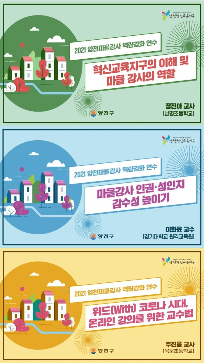 [시민일보 = 이대우 기자] 서울 양천구(구청장 김수영)가 이달 한달간 양천혁신교육지구에서 활동하는 마을강사를 대상으로 온라인 강의 플랫폼을 활용해 비대면 역량 강화 연수를 진행한다.