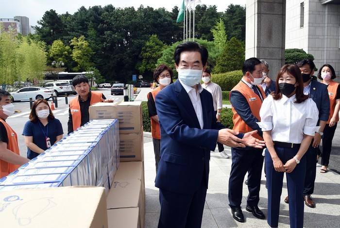한다헬스케어(주)가 코로나19 장기화에 따른 확산 방지를 위해 경기 의정부시자원봉사센터에 마스크 총 24만장을 후원한다. 한다헬스케어(주)는 매월 1만장씩 24개월 동안 총 24만장을 의정부시자원봉사센터에 후원할 예정이다. 사진은 12일 열린 마스크 전달식에서 안병용 시장(가운데)이 관계자들과 이야기를 나누는 모습. (사진제공=의정부시청)