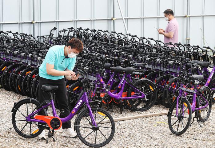 3일 오전 경기 수원시 권선구 고색동의 한 공터에서 수원시 무인대여자전거 '타조(TAZO)' 관계자들이 시범운영을 앞둔 자전거를 점검하고 있다. '타조(TAZO)'는 4일부터 100대를 시범운영 한 후 오는 10월부터 1000대의 자전거를 투입해 정식 운영을 시작할 예정이다.
