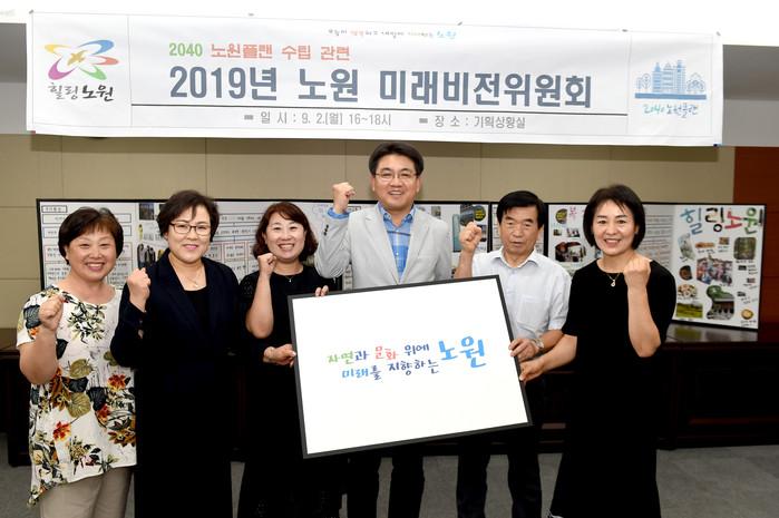 서울 노원구는 2일 구청 기획상황실에서 ‘2019년 노원 미래비전위원회’를 개최했다. 이날 2040노원플랜 중간보고 및 토론 등의 순으로 진행됐다. 사진은 이날 참석한 오승록 구청장(오른쪽에서 세 번째)이 인사말을 전하는 모습. (사진제공=노원구청)