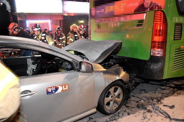 서울 도봉소방서는 30일 오전 0시30분경 도봉구 창동 우이3교 부근에서 발생한 교통사고 현장에서 부상을 입은 택시 승객과 오토바이 운전자를 구조해 현장 응급처치를 한 후 인근 병원으로 이송했다. 사진은 교통사고 발생 현장 모습. (사진제공=도봉소방서)