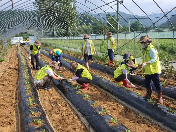 경기 양평군 단월면지역사회보장협의체는 지난 25일 단월면 부안리에 소재한 300㎡ 규모의 단월면의 명물 ‘힐링하우스’에 사랑나눔 김장배추 심기 활동을 전개했다. 식재한 ‘사랑나눔’ 배추 모종은 오는 11월 초 수확해 김장을 담가 지역의 어려운 이웃과 소외계층을 위해 전달될 예정이다. 사진은 참여자들이 배추를 심고 있는 모습. (사진제공=양평군청)
