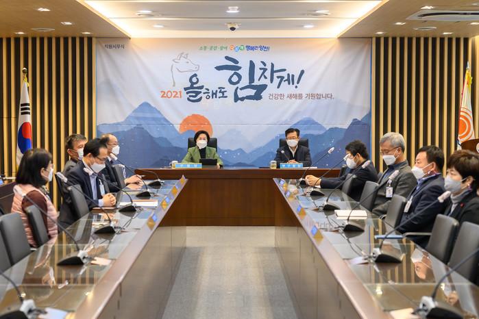 서울 양천구는 4일 양천구청 공감기획실에서 랜선 진행 방식으로 2021년 시무식을 열었다. 사진은 이날 김수영 구청장(가운데 왼쪽)이 시무식에서 신년사를 하고 있는 모습. (사진제공=양천구청)