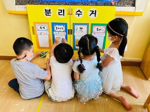 | ▲ 환경순찰 지킴이 교육에 참여한 어린이들이 분리수거 체험활동을 하는 모습. (사진제공=강북구청) |