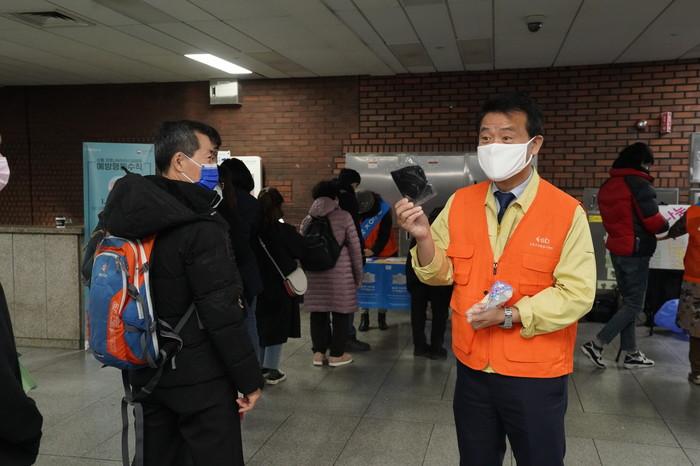 서울 성북구가 오는 31일까지 지하철역에서 코로나19 극복을 위한 '착한 마스크 나눔 캠페인'을 펼친다. 캠페인은 감염 취약군이 부족한 보건용 마스크를 우선 사용하도록 양보하는 운동이다. 사진은 최근 이승로 구청장이 시민들에게 캠페인 취지를 설명하는 모습. (사진제공=성북구청)