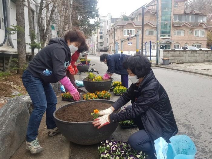 경기 안산시 단원구 선부3동 행정복지센터는 최근 코로나19로 침체돼 있는 지역 분위기를 살리고 봄내음 풍기는 아름다운 보행환경을 조성하기 위해 행정복지센터 일대에 팬지, 비올라 등 봄꽃을 심었다. 사진은 센터 관계자들이 꽃을 심고 있는 모습. (사진제공=안산시청)