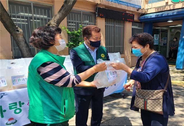 인천 동구 송림2동 새마을부녀회가 최근 저소득 홀몸노인들의 건강한 여름나기를 위한 '사랑愛 닭죽 나눔 행사'를 열고 한방 닭죽을 끓여 120명의 홀몸노인에게 전달했다. 사진은 이날 행사에 참여한 허인환 구청장(가운데)이 홀몸노인에게 닭죽을 전달하고 있는 모습. (사진제공=인천 동구청)