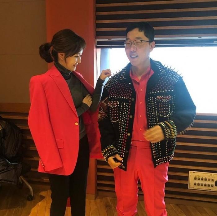 ‘굿모닝fm 김제동입니다’ 공식 SNS를 에서는 '#핫핑크 와 #찡은 덤 같은 핑크 다른 느낌 #깜짝 놀란 수지 아나운서 #핑크로 달랜 우식 쌤'이라는 글과 함께 한 장의 사진이 게재됐다.