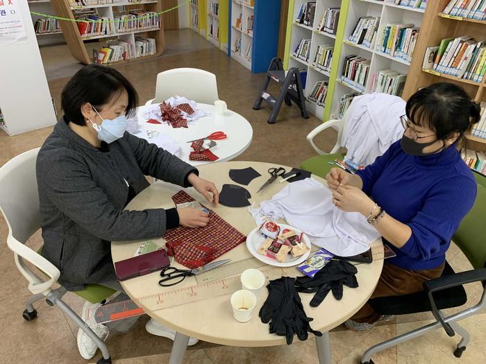 서울 양천구 목3·4동이 코로나19의 지역사회 감염 확산 방지를 위해 직접 제작한 면 마스크 1000장을 기부하고, 만 60세 이상 수급자, 저소득 노인을 위한 대체식 조리·배달을 실시했다. 사진은 ‘목3동사랑회’ 회원들이 면 마스크를 제작하고 있는 모습. (사진제공=양천구청)