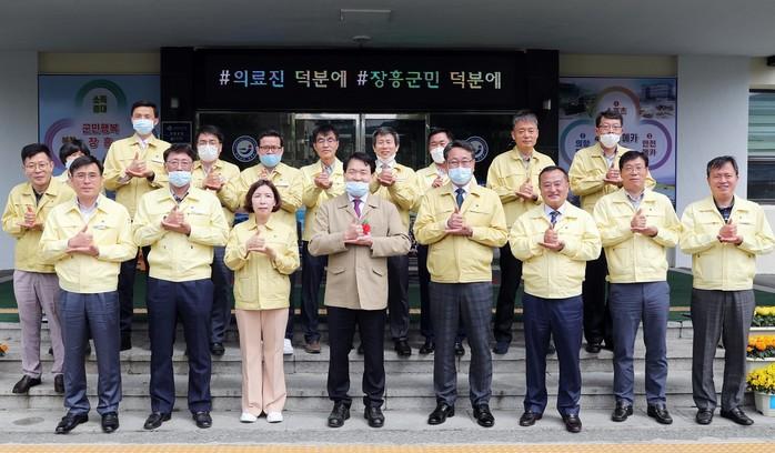 정종순 전남 장흥군수가 8일 코로나19 진료에 헌신하고 있는 의료진에게 고마움과 존경을 뜻하는 수어를 사진이나 영상으로 표현하는 '덕분에 챌린지' 캠페인에 동참했다. 사진은 정 군수(앞줄 왼쪽 네 번째)와 직원들이 엄지손가락을 치켜든 수어동작을 취하며 기념촬영하는 모습. (사진제공=장흥군청)