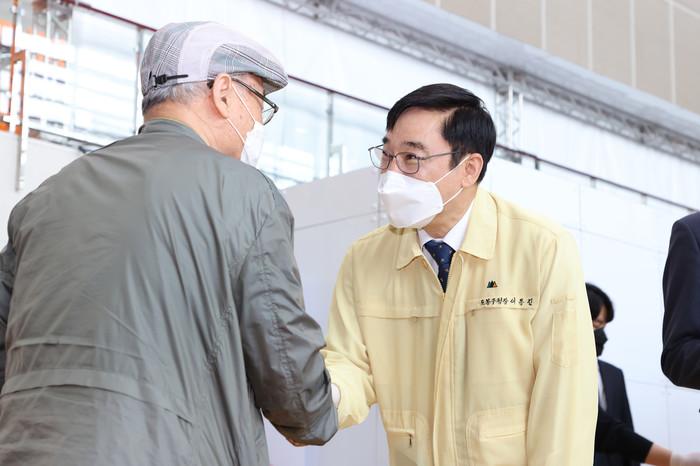 이동진 서울 도봉구청장은 지난 25일 코로나19 예방접종센터를 찾아 주민들의 안내를 돕고, 의료진들을 격려했다. 사진은 이날 이 구청장(오른쪽)이 접종을 마친 주민을 만나 접종 유의사항 등을 안내하고 안부를 묻고 있는 모습. (사진제공=도봉구청)