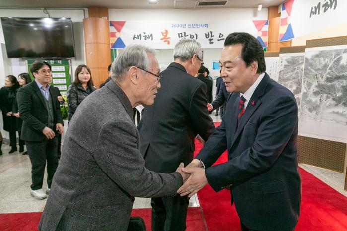 서울 강서구는 8일 구민회관에서 ‘2020년 신년인사회’를 개최했다. 이날 노현송 구청장은 신년사를 통해 새해 구정 운영방향과 지난해 거둔 성과들을 주민들과 함께 나눴다. 사진은 노 구청장(오른쪽)이 주민과 인사를 나누는 모습. (사진제공=강서구청)