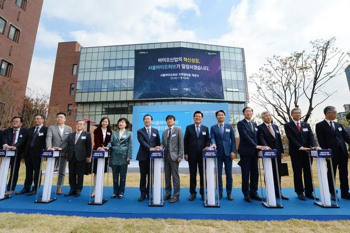 유덕열 동대문구청장이 5일 서울바이오허브에서 열린 ‘서울바이오허브 지역열린동 개관식’에 참석해 시설 개관을 축하했다. 사진은 개관식에 참석한 유 구청장(오른쪽 여섯 번째)의 모습. (사진제공=동대문구청)