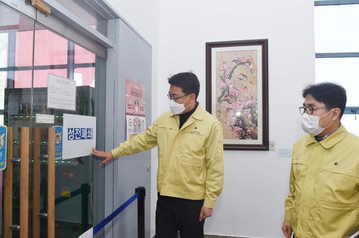 오승록 노원구청장은 최근 지역내 폐쇄된 신천지 교회를 찾아가 현장 점검을 했다. 구는 지난 19일 지역내 신천지 교회와 교육장 등 10여곳을 신속하게 폐쇄하고 소독을 마친 상태다. 사진은 오 구청장(왼쪽)이 방역 상황을 살피는 모습. (사진제공=노원구청)
