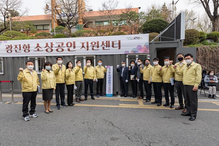 서울 광진구는 1일 ‘광진형 긴급운영자금’을 원스톱으로 지원하는 ‘광진형 소상공인 지원센터’를 구청 주차장에 설치해 운영에 들어갔다. 사진은 센터 현판 제막식에 참석한 김선갑 구청장 및 관계자들이 기념촬영을 하는 모습. (사진제공=광진구청)