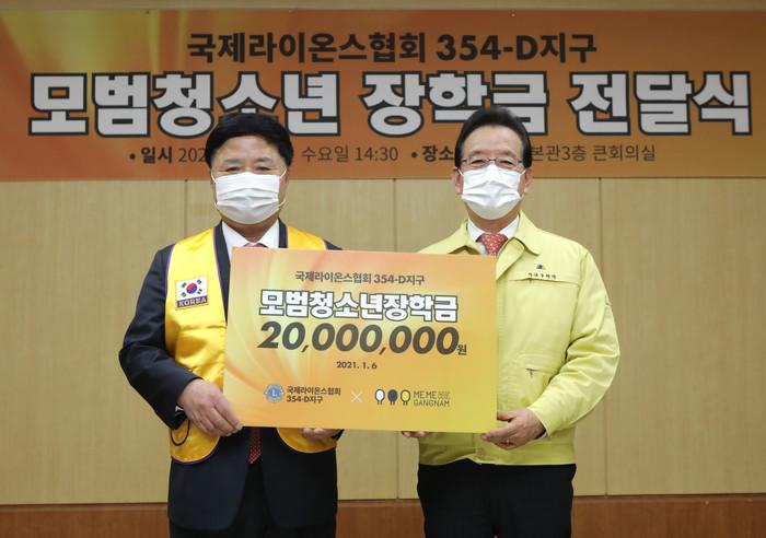 서울 강남구는 6일 국제라이온스협회 354-D 지구로부터 양육시설 아동을 위한 학업지원금 2000만원을 전달받았다. 지원금은 개인별 월 25만원씩 6개월 동안 사회복지공동모금회를 통해 전달될 예정이다. 사진은 전달식에서 정순균 구청장(오른쪽)이 관계자와 기념촬영을 하는 모습. (사진제공=강남구청)