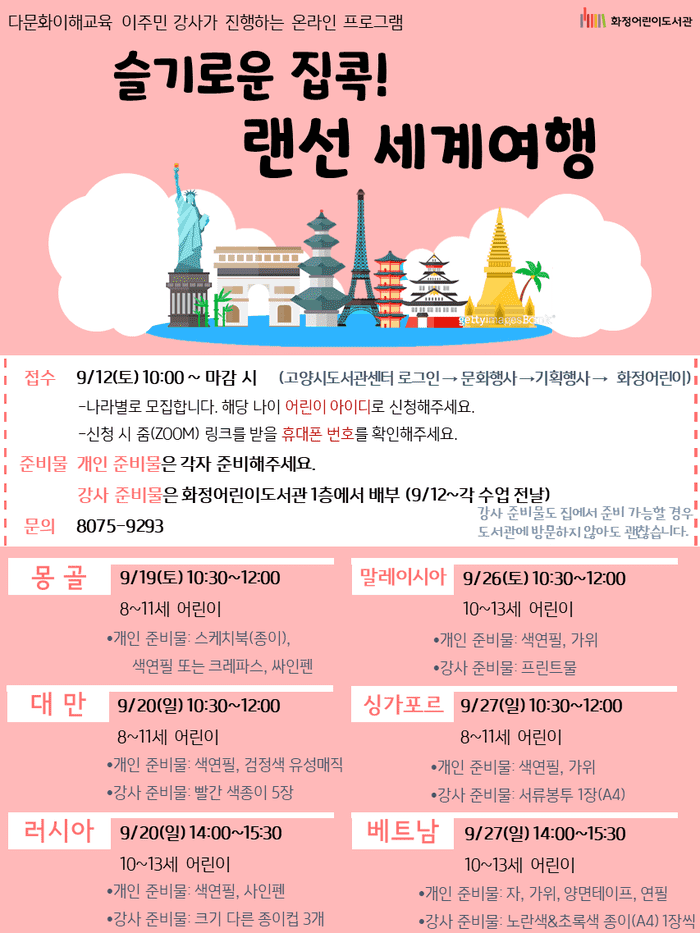 [고양=이기홍 기자] 고양시 화정어린이도서관이 초등학생을 대상으로 「슬기로운 집콕! 랜선 세계여행」을 운영한다.