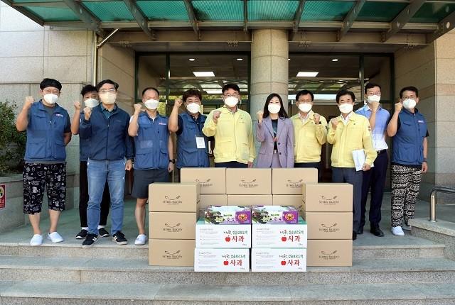 [광주=정찬남 기자] 김종효 광주광역시 행정부시장(사진, 가운데)이 15일 오전 코로나19 생활치료센터인 중소벤처기업진흥공단 호남연수원을 방문해 근무자들을 격려한 뒤 기념촬영을 하고 있다.