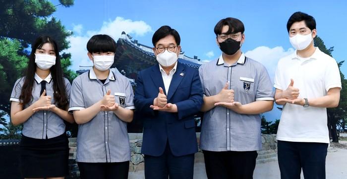 경기 광주시 태전고등학교 학생들이 최근 시청을 방문해 신동헌 시장을 만나 코로나19를 막기 위해 고군분투 하는 의료진들을 위한 감사의 편지와 배지를 전달하고 ‘덕분에 챌린지’에 동참했다. 사진은 신 시장(가운데)과 학생들이 챌린지 포즈를 취하는 모습. (사진제공=광주시청)
